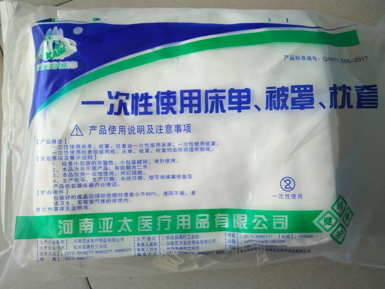 产品结构: 本品由非织造布裁切缝制或热合而成,A型由被罩组成,B型由枕套组成,C型由床单组成,D型由被罩、枕套、床单组成。