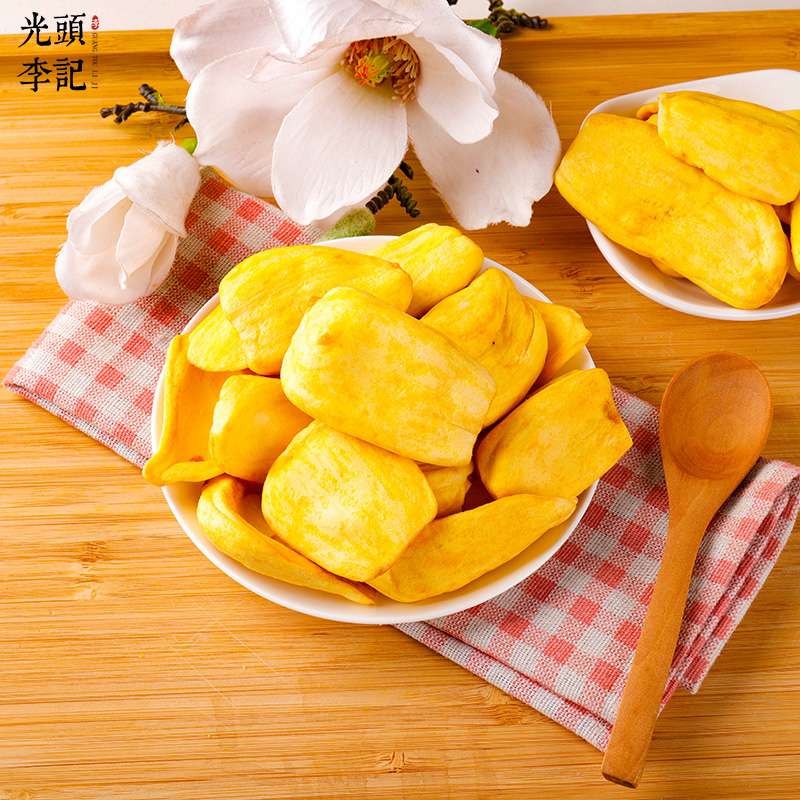 新鲜菠萝蜜,采用VF工艺制成菠萝蜜脆,锁住新鲜,锁住美味,使菠萝蜜脆保持原有的色、香、味、形,原滋原味,酥脆爽口,果香四溢,齿颊留香。
