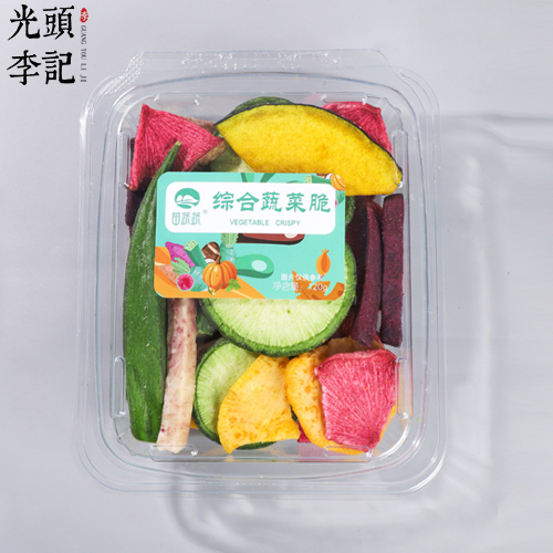 山东光头李记食品有限公司苗蔬蔬透明盒系列综合蔬菜脆,VF工艺制作而成的综合蔬菜脆,采用极简透明的包装,可以更加直观的看到产品的状态,外形、颜色、品质一目了然,能直接突出产品的优势和卖点,既能体现出果蔬脆的自然美感,又在视觉上直接让顾客对商品有一定的认知,便于顾客识别选购。透明开窗适合陈列展示,高颜值的果蔬脆色彩鲜艳,透过透明的包装,更能吸引顾客的目光尤其是小朋友的注意力,用颜值吸引目光,用美味征服人心。