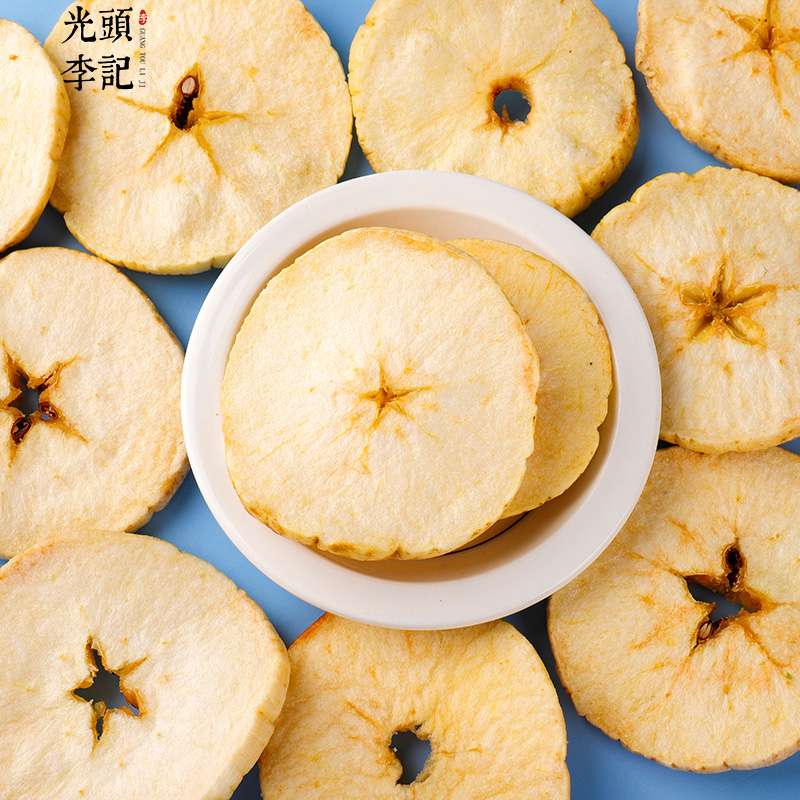 新鲜苹果,采用FD工艺制成苹果脆,锁住新鲜,锁住美味,使苹果脆保持原有的色、香、味、形,原滋原味,酥脆爽口,果香四溢,齿颊留香。