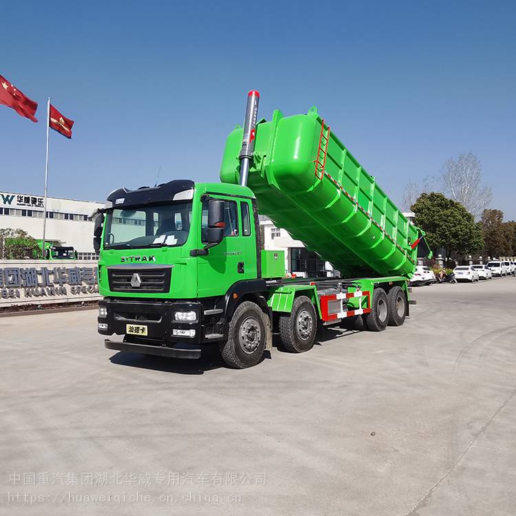 国六汕德卡8X4底盘:ZZ5316XXYN466GF1,C5H-W驾驶室;MC07.340-60发动机;HW15710变速器+HW50法兰式取力器;H153自调臂前轴(鼓);16吨双后桥。11.00钢丝胎;速比4.875;300L油箱;中国重汽智能通A版;轴距1800+3800+1350。1、厢体有效容积:按公告尺寸制作(25立方米);2、厢体采用不锈钢材质或碳钢制作,5毫米厚钢板,封头6毫米厚;3、采用国产多节前顶置油缸,一方面可使力点前移,油缸负载减小,工作更平稳,另一方面可避免双油缸可能出现的不平衡状态的发生;液压部门采用国内知名厂家产品;4、进料口为液压控制开启与关闭,进料口设置密封圈,防止进料口关闭后臭气或污泥溢出,罐顶口设置一个开启盖,尺寸为2000x1000 mm。5、液压控制后盖开启和关闭,并采用液压锁紧装置,并配以密封橡胶圈,另在后盖下部左右锁紧装置,确保污泥、泥浆滴水不漏;6、可套液压系统,方便用户操作,其中手动系统为多路阀操作,控制装、卸料操作;7、爬梯和罐体上部平台采用防滑材料,确保安全、防滑;8、在罐体适当位置均按照国家标准粘贴3C(3M-2)反光标识,保险杠颜色按公告制作。