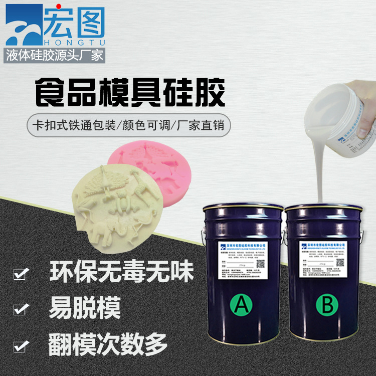食品级液体硅胶为A、B组份加成型硅胶,这里以宏图硅胶的食品级硅胶为例,它通过FDA食品级认证,可加温固化和常温固化;具有耐高、低温,不冒油以及耐磨耐用等特点。常用于高挡次浇注成型产品、翻糖拉丝模具、蛋糕模具、巧克力模具、火锅油、糖果模具、布丁、慕斯等食品模具的翻模制造。