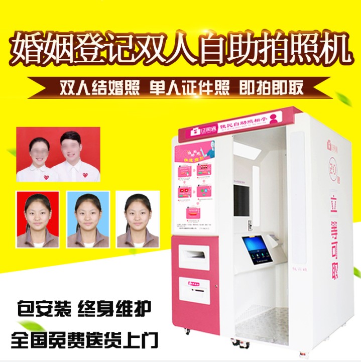 自助照结婚照的机器又名为:双人自助证件机、婚姻自助照相亭、双人自助拍照机、结婚照自动照相机、双人位自助证照机器…叫法很多,在各地很多地方都可以看到这种机器,主要放于民政局、婚姻登记大厅内服务广大办理业务人员,既可以拍摄结婚照、离婚照片和各类单人证照片。目前深圳证照通厂家、深圳市易触得科技做这块比较稳定,照片保存长久不褪色,用于婚姻登记处的较多。