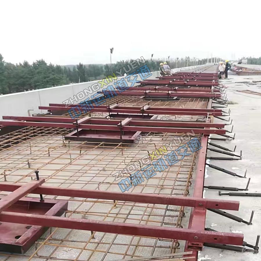 CRTSⅢ型板式无砟轨道底座板施工成套工装,用于高速铁路CRTS Ⅲ型板式无砟轨道底座板施工,能精确控制底座板两侧排水坡坡度和顶面平整度。主要包括如图所示:底座侧模板、伸缩缝模板、限位凹槽及支架、坡度调节板、支撑系统。