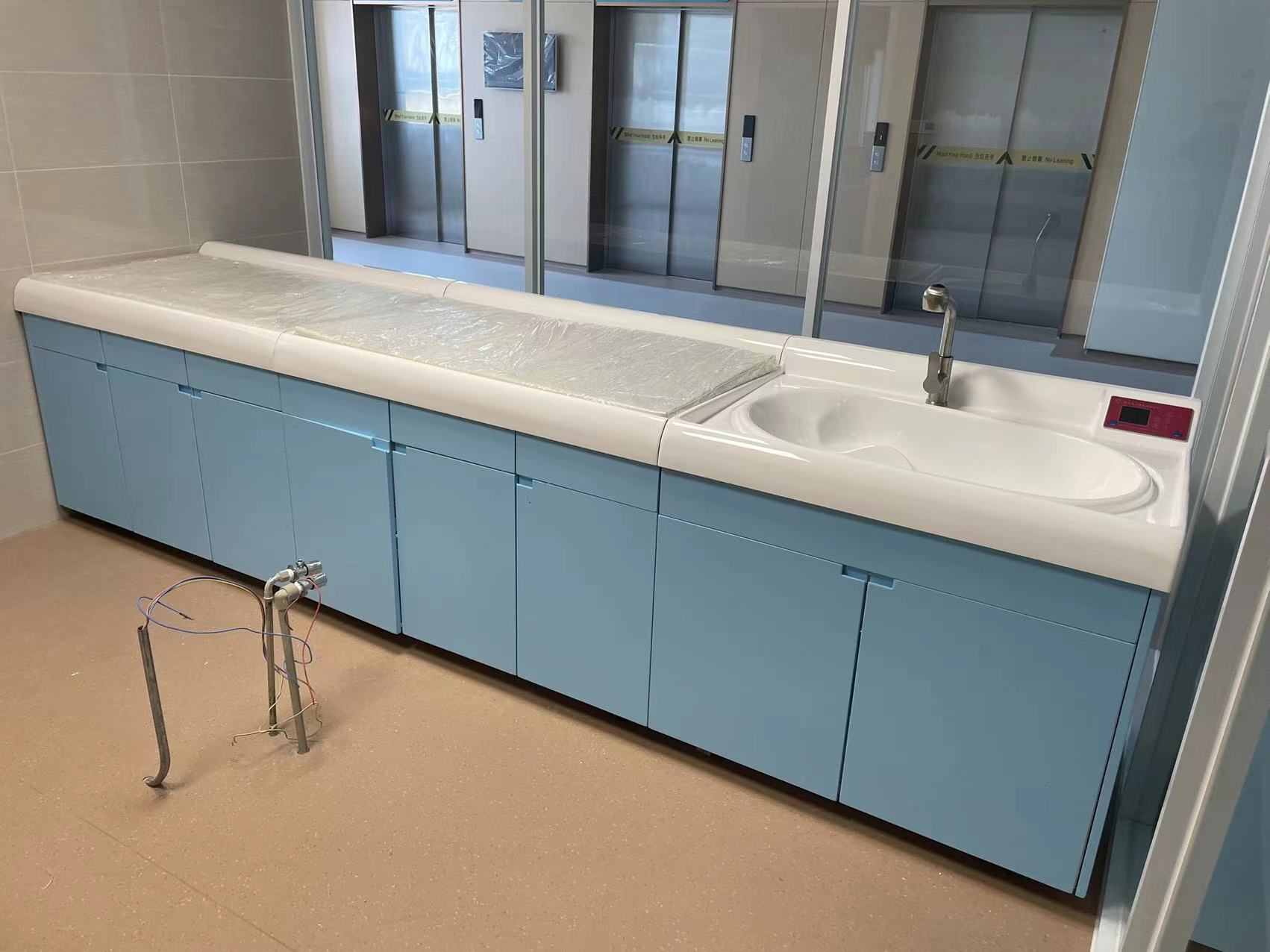 护理平台面(软包):采用全台面外包全新人造皮革,内置加厚海绵,柔软舒适安全,并且防水防尿,台面为10cm软包,防水防潮,颜色可定制,护理台内部做抽屉,分层处理,为临床操作医生提供足够的储物空间