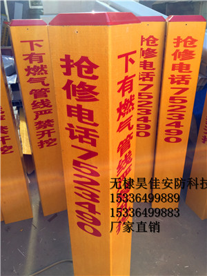 玻璃钢标志桩:经高温压制而成。抗冲击,耐磨损,耐高温,耐腐蚀,可以抗水、汽油、酒精、电解盐、醋酸、钠钾化合物、尿、沥青,适合各种酸碱土壤。使用寿命长达30年。内容采用丝网印刷技术,警示效果好,不需要维护。重量轻,便于运输安装。无回收价值,自然防盗。