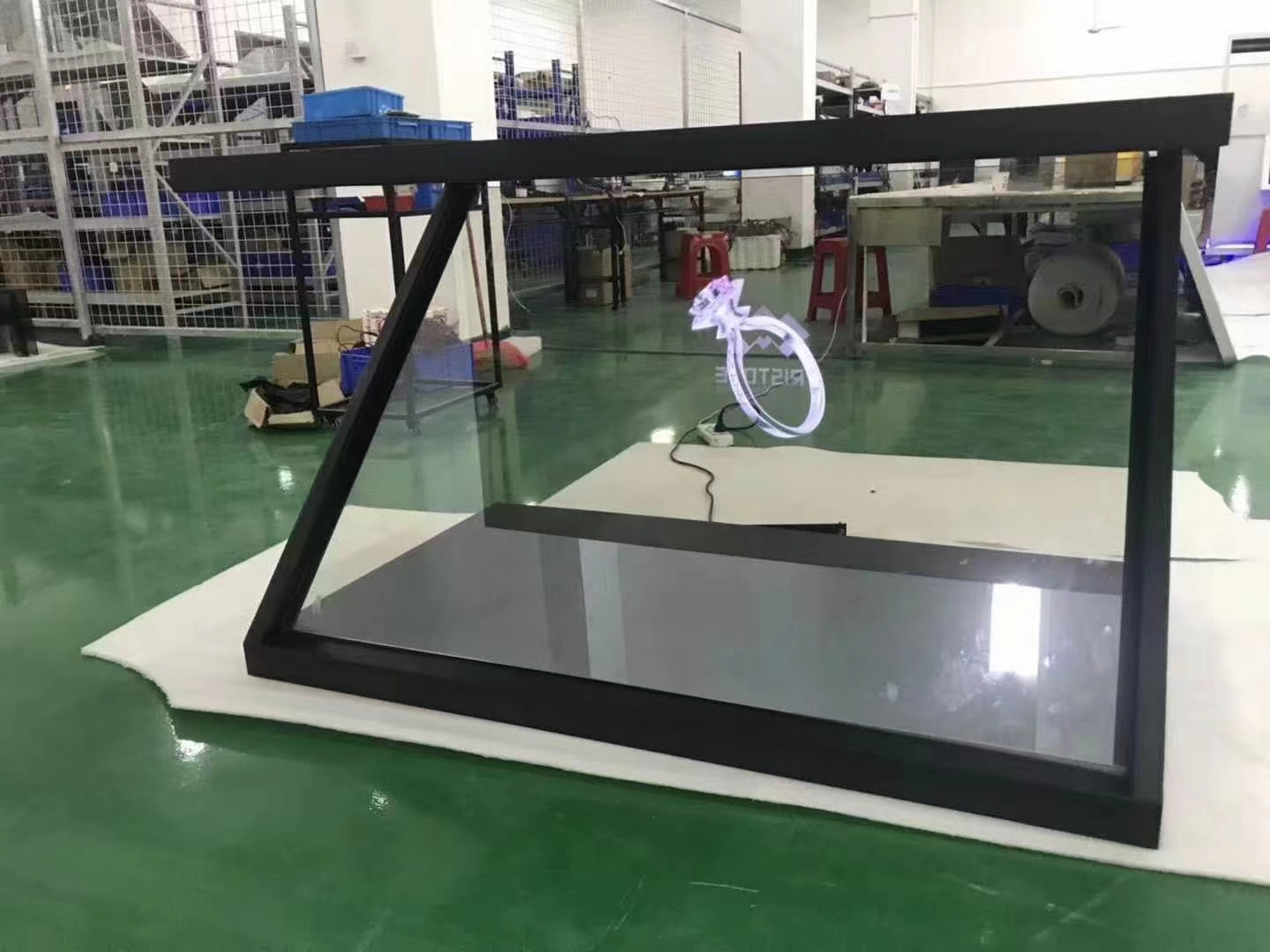 1: 幻影成像展示系统主要由实物展示台(也称实物模型)、成像光源(投影机或者Led屏等显示设备)、3D 视频、幻影成像膜、计算机多媒体系统。