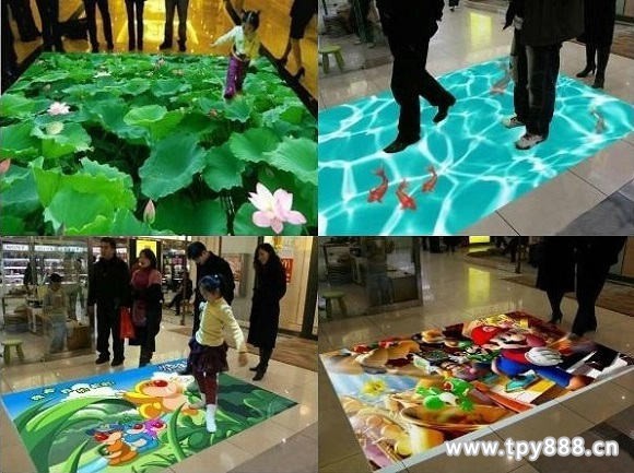 除了适合各年龄层用户外,地面互动投影的展示内容更是五花八门,我们在商场、餐厅中常见的鱼水互动、地面花海互动