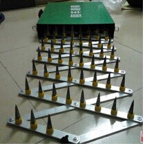 材质;障器是采用特制的连环双排梅花桩空心钢钉带倒刺、实战拦截效果好,车轮一旦碾上,刺钉就与连环板脱离,高速自行钻入轮胎内心,