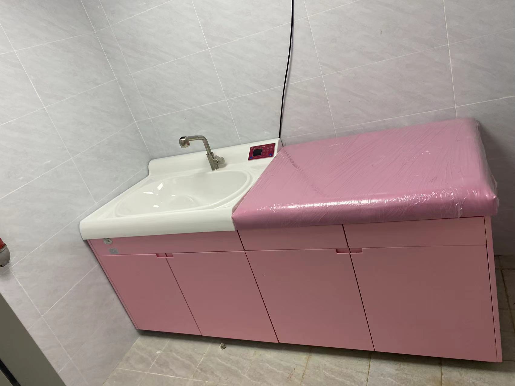 洗礼池:婴儿洗澡池低部圆滑突起设计;给婴儿一防滑支撑点,防止婴儿在池内滑动,造成意外呛水,池内设计的曲线模型与婴儿后背完全贴合,让婴儿洗浴时保持舒适的姿势,台面设计与池为一整体,与豪华背板都采用面层为优质的A级PMMA高分子复合材料一体成型,具有抗压强度高,柔韧性好,耐候性优良;抗氧化,耐酸碱,表面光滑,易清洗(表面细菌残留量远远低于不锈钢,人造石,陶瓷盆和其他普通塑料),耐磨损,寿命长,防腐防潮,永不生锈,对人体无毒性等特征及优点。池边全弧形设计美观大方,同时裙边防返水设计,让多余的水从导水沟排走