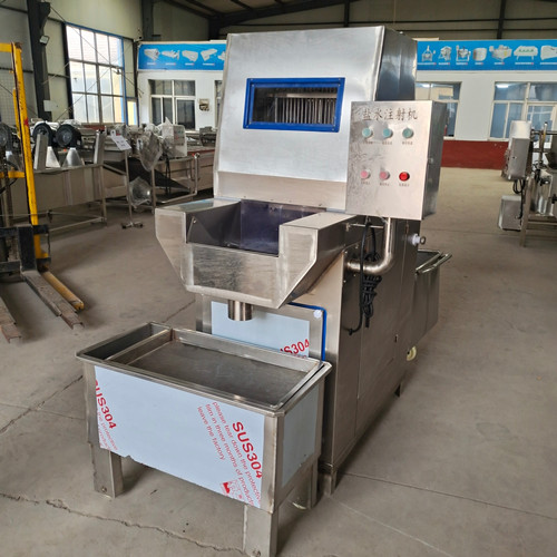盐水注射机可将盐水及辅料配制的腌制液注入肉块中,再通过真空滚揉使料液充分腌渍,渗透,可疏松肌肉组织结构,有利于肌球蛋白溶出,并且由于添加剂对原料肉离子强度的增强作用和蛋白等特点的调整作用,注入配制的水溶液能使肉质嫩化、松软,从而提高了肉制品的出品率和改善肉制品的嫩度和口感。