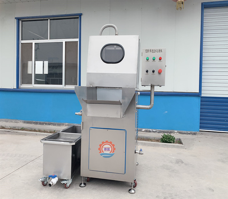 盐水注射机是将盐水及辅料注入肉中充分腌渍,注入配制的水溶液的肉块能使肉质嫩化、松软、提高了肉制品的品位和出品率。可根据不同工艺要求,调整步进速度,步进距离,压肉板间隙及注射压力,将腌渍液均匀连续地注入肉中,达到理想的注射效果。