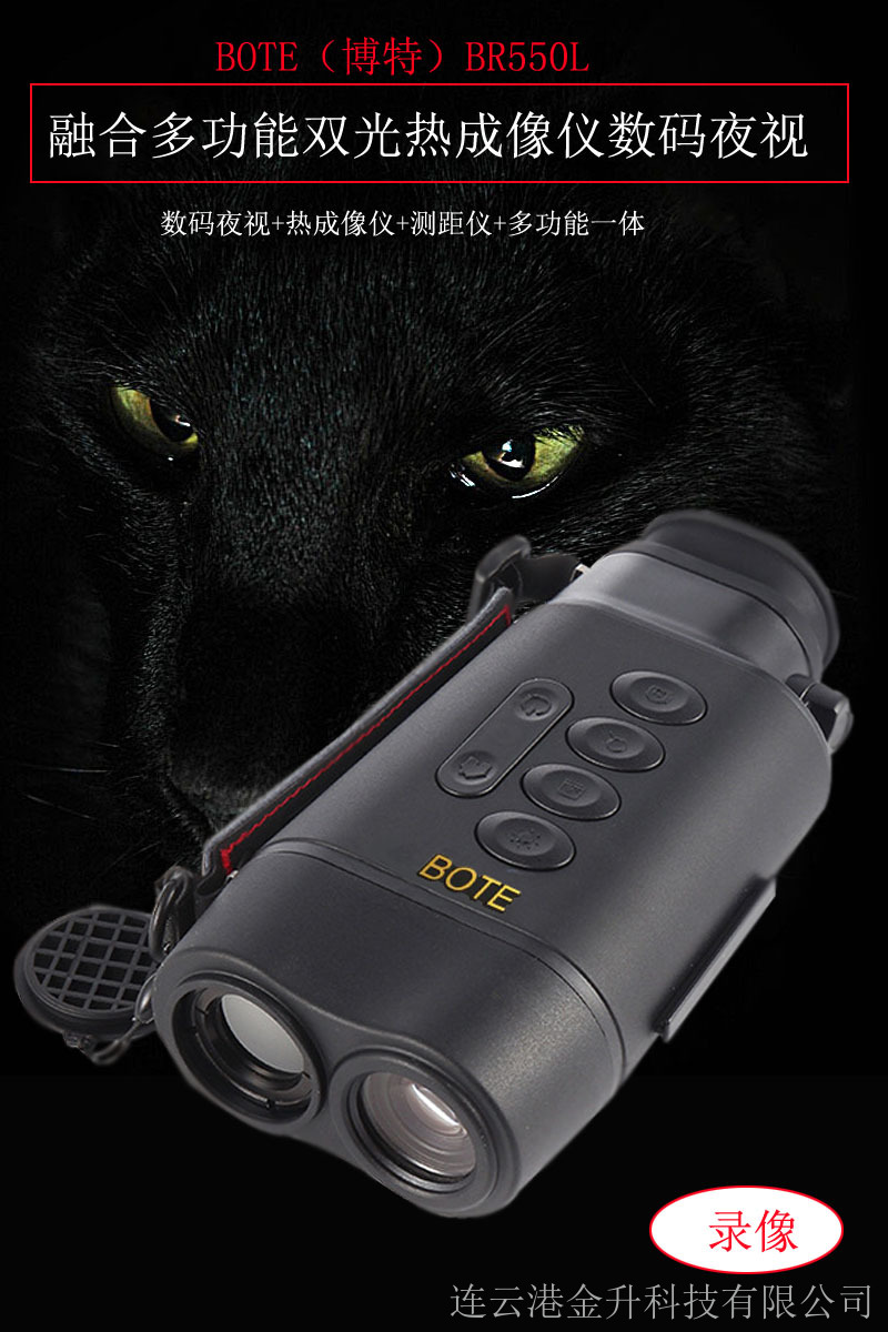 BOTE(博特)融合多功能双光热成像仪数码夜视BR550L(具备红外热像仪+夜视仪+测距仪功能一体多了录像功能)  BR550L是一款双光融合热像仪。它采用红外、微光融合,结合了红外、微光各自的优势,使成像分辨率更高,单体更易被识别,且解决了单红外不能透过玻璃的缺陷,同时它又新增加融合聚焦(画中画)功能,能对单点进行放大且保持很高的清晰度。