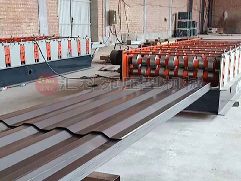 开卷-----导向进料-----辊压成型-----定长切断-----成品出板(人工上卷----人工操作电器系统设置----按启动设备正常运转------达到预先设置的板材尺寸后自行切断,此设备的压板成型完成。