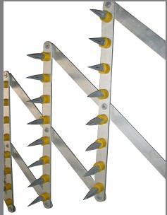 5、在需要执行拦截疑犯车辆任务时,按动遥控器上端的大按钮,路障块内的不锈钢空心针即自动竖起,此时如强行通过路障,车轮将被刺进数枚不锈钢破胎空心针,轮胎在两秒钟内立即放气,不能继续行驶,只能停车。