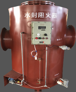 溢流水封阻火器通过内部的溢流装置对液位进行控制,从而达到对管路压力的调节,既要保证气体能够顺利的在输送管道内流通,又要实现阻火功能,同时起到了抑制爆渣传播的功能。脱水型溢流水封阻火器是安装在抽放管正压端的一种安全保障装置,当瓦斯抽放管道发生意外爆渣事故时,防止爆渣产生的冲击波破坏抽放系统,并阻断爆渣产生的火焰沿抽放管路传导,防止事故进一步扩大的一种安全装置。同时在需要高度处设置有一个溢流口,罐体中的水位到达溢流口高度时,多余的水将自动溢出。另外在瓦斯气出口前设置脱水材料,让瓦斯气流出前进行脱水。 该阻火器主要用于细水雾后端水较多的管道上。