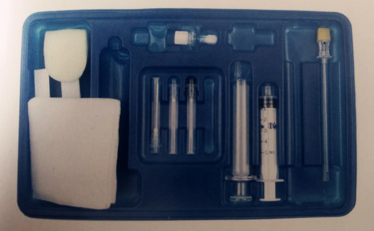 (结构及组成):本品由一次性注射器、玻璃注射器、纱布块、药液过滤器、一次性刷子、国标手套、针头、腰穿针、包布、洞巾、敷料贴、托盘、治疗巾组成。