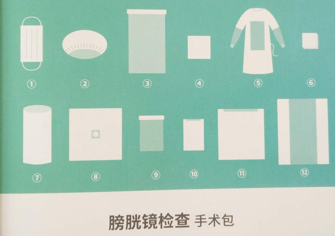 手术包配置:一次性使用医用口罩1个、一次性使用帽1个、器械盘套1条、擦手巾(40*40cm)4块、一次性使用手术衣(加强型)2件、纱布块10片、脚套2双、微型单1条、臀垫单1条、边单(75*90cm)3条、边单(150*150cm)1条、一次性使用包布1条。