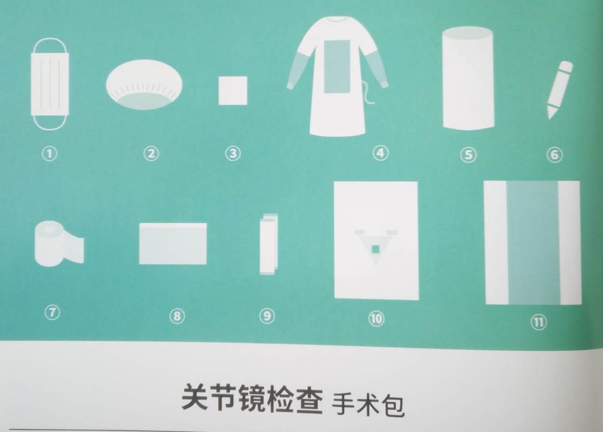 手术包配置:一次性使用医用口罩1个、一次性使用帽1个、擦手巾(40*40cm)4块、一次性使用手术衣(加强型)2件、集液袋1个、弹性绷带1卷、脚套1双、医用记号笔1支、备胶料(10*50cm)2条、关节镜检查单1条、一次性使用包布1条。