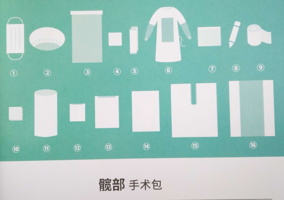 手术包配置:一次性使用医用口罩1个、一次性使用帽1个、器械盘套1条、擦手巾(40*40cm)4块、备胶料(10*50cm)2条、一次性使用手术衣(加强型)2件、集液袋1个、医用记号笔1支、弹性绷带1卷、纱布块5块、脚套1双、U型单1条、脚单1条、边单4条、麻醉单1条、一次性使用包布1条。