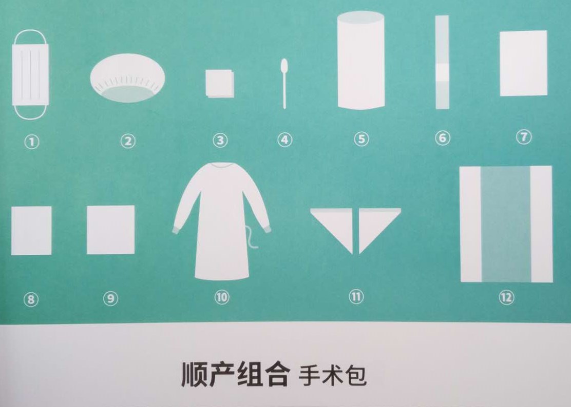手术包配置:一次性使用医用口罩1个、一次性使用帽1个、纱布块4块、医用棉签4支、鞋套1双、婴儿护脐贴1包、一次性使用手术衣1件、一次性使用医用垫单4条、机制垫单(45*60cm)1条、机制垫单(60*60cm)1条、脚套1双、一次性使用包布1条。