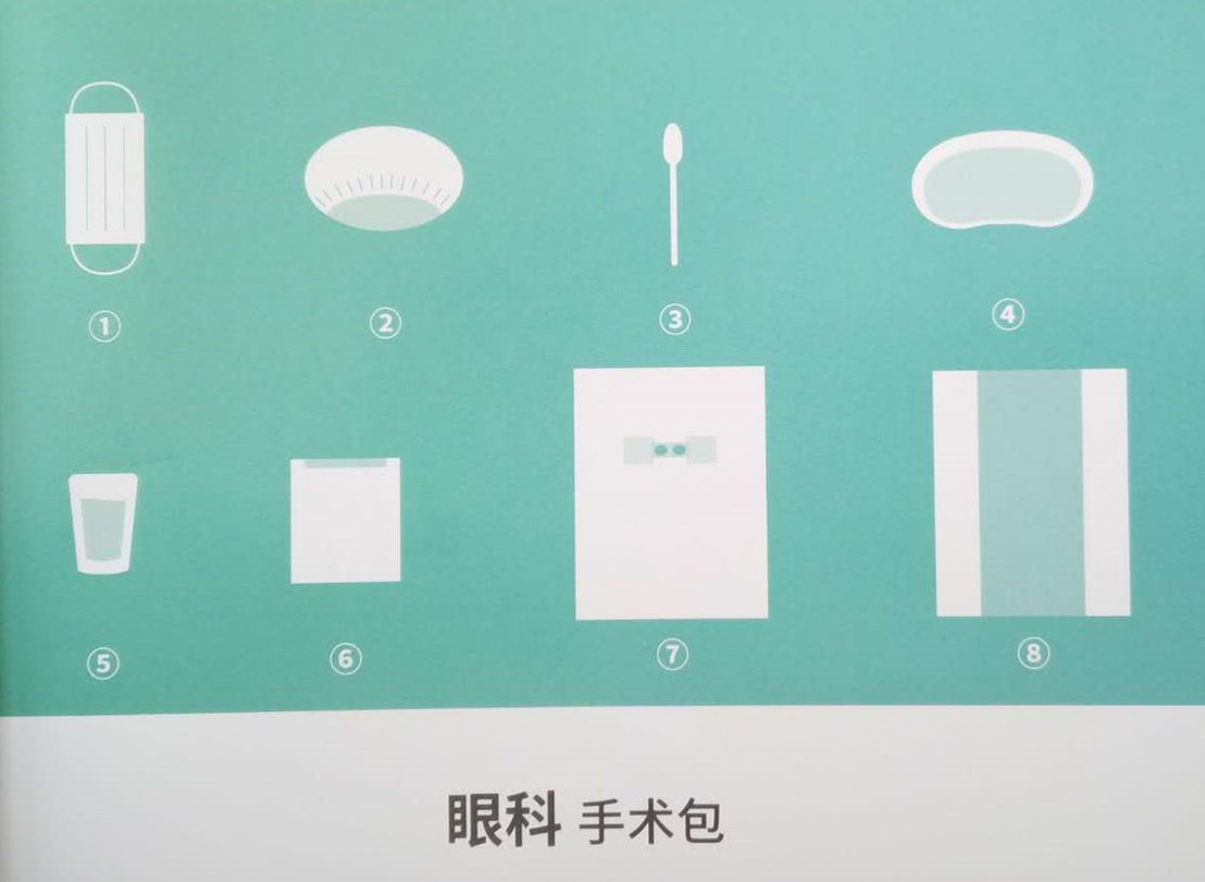 手术包配置:一次性使用医用口罩1个、一次性使用帽1个、医用棉签10支、弯盘1个、药杯(60ml)3个、边单2条、眼科手术洞巾2条、一次性使用包布1条。