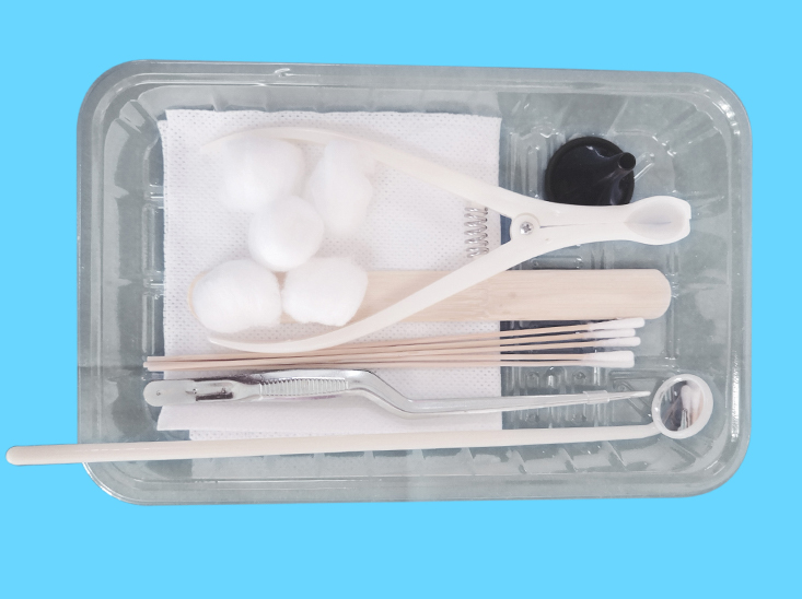 IV型基本配置:一次性使用间接喉镜、医用棉签、托盘。选用配置:医用镊、压舌板、纸巾纸、医用棉球、PE检查手套、一次性使用医用橡胶检查手套、一次性使用治疗巾、医用输液贴、包布、围巾、小碗、医用非织造布敷料块组成。