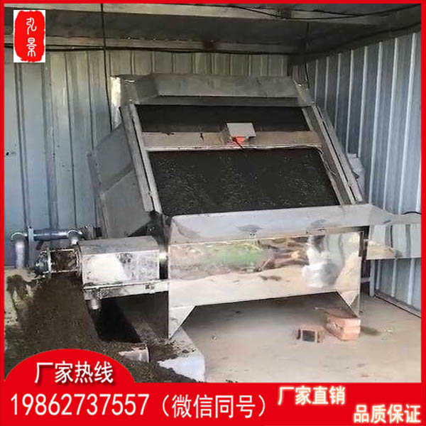 鸡粪粪水分离机工作原理:用专用的切割式潜污泵将原渣液提升送至固液分离机内,待处理的渣液通过溢流均匀分布到不锈钢斜筛网面上,由于筛网表面间隙小,平滑,背面间隙大,排水顺畅,不易堵塞;固态物质被截留,过滤后的液体从筛板缝隙中流出,从排水管排出;同时在斜作用下,固态物质被推到筛网中的螺旋轴,压榨分离出固态物质,从而达到固液分离的效果。
