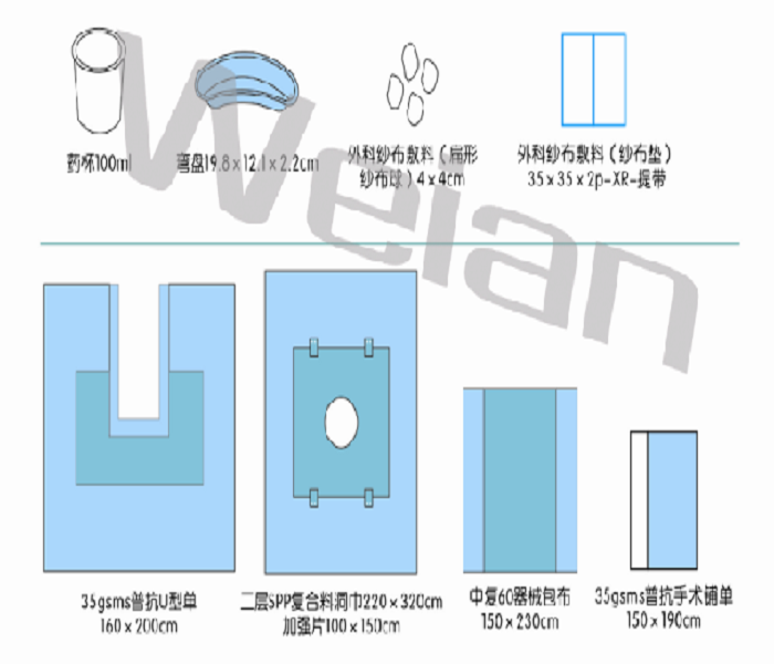 (结构及组成):基本配置:手术单。选配产品:手术铺单、纱布垫、弯盘、药杯、纱布球、治疗巾、U型单、袜套、备胶料、洞巾、子母扣、集液袋、包布。