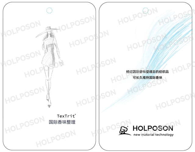 HOLPOSON® Yang Yuhuan 是加拿大归国留学博士与东华大学博士团队共同开发的高分子络合持久留香整理剂,产品是将绿茶,芦荟,薰衣草,玫瑰,茉莉,紫丁香,薄荷,艾草, 青苹、柠檬、草莓等香味的精油包覆在聚氨酯多孔微囊中制成的纺织品后整理用香味整理剂。微胶囊包裹的香味整理剂处理的纺织品面料纤维可保持长久的留香时间,耐水洗可达10次以上。适用于:家纺、服装、车内饰、地毯、袜子、内衣、沙发面料等。