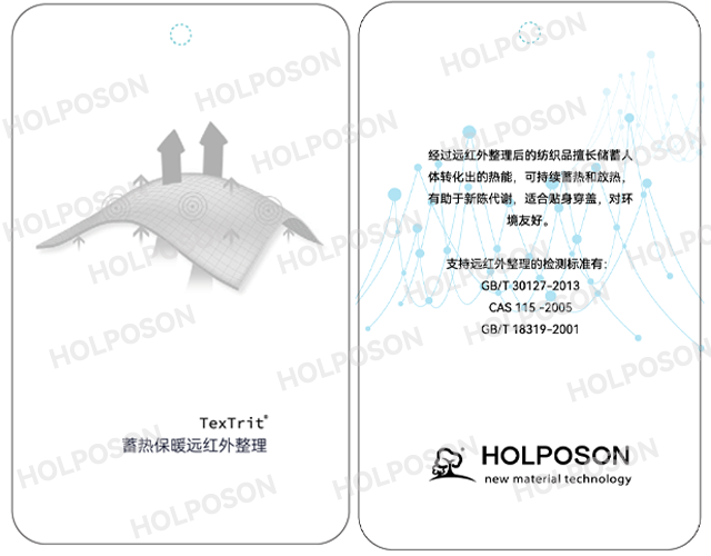 HOLPOSON®Cyclopsman 主要成分为特殊陶瓷粉,可长久贮存。此款产品是由东华大学博士团队开发的纺织品多功能整理剂,本身除了有发射远红线使人体体感上升的功能之外还有利于消臭吸附异味,是多功能整理剂。适合用于棉,粘胶、毛、腈/毛,涤纶,锦纶等各种纤维的后整理。HOLPOSON® Cyclopsman在:家纺、服装、袜子、内衣、手套等领域有广泛应用。
